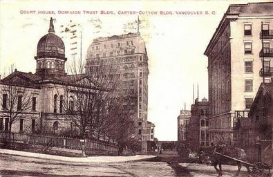 | Keywords: outdoor architecture "Court House, Dominion Trust Bldg., Carter-Cotton Bldg. Vancouver, B. C." Private Post Card. No. 10. Printed in Germany. View looking north down Cambie Street from the intersection at West Pender Street in Vancouver, BC. The old Courthouse, viewed at the NW corner of Cambie and Pender Streets. Built in 1888 (wing with dome completed in 1890), it was the first major public building outside the old Gastown area. Demolished in 1912 when the new Courthouse opened at Georgia and Hornby Sts., the site was used for recruiting during the Great War years. After the war, a Cenotaph was erected and the park officially dedicated as Victory Square (1924). "Court House, Dominion Trust Bldg., Carter-Cotton Bldg. Vancouver, B. C." Private Post Card. No. 10. Printed in Germany. View looking north down Cambie Street from the intersection at West Pender Street in Vancouver, BC. The old Courthouse, viewed at the NW corner of Cambie and Pender Streets. Built in 1888 (wing with dome completed in 1890), it was the first major public building outside the old Gastown area. Demolished in 1912 when the new Courthouse opened at Georgia and Hornby Sts., the site was used for recruiting during the Great War years. After the war, a Cenotaph was erected and the park officially dedicated as Victory Square (1924). |