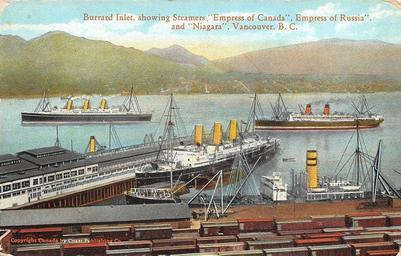 | Keywords: outdoor "Burrard Inlet, showing Steamers "Empress of Canada", Empress of Russia", and "Niagara", Vancouver, B. C. Copyright Canada by Coast Publishing Co." Post Card. 102788. Published by The Coast Publishing Co., Vancouver, B. C. Made in U.S.A. View looking north towards Burrard Inlet and the North Shore and North Vancouver over the Canadian Pacific Waterfront Railway yard and docks (Pier 'D') in Vancouver, BC. "Burrard Inlet, showing Steamers "Empress of Canada", Empress of Russia", and "Niagara", Vancouver, B. C. Copyright Canada by Coast Publishing Co." Post Card. 102788. Published by The Coast Publishing Co., Vancouver, B. C. Made in U.S.A. View looking north towards Burrard Inlet and the North Shore and North Vancouver over the Canadian Pacific Waterfront Railway yard and docks (Pier 'D') in Vancouver, BC. |
