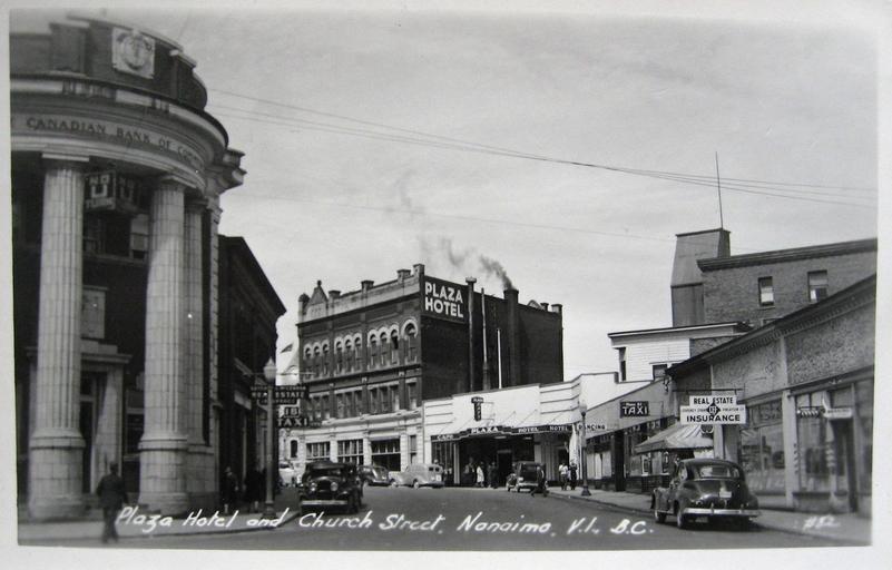 Keywords: photo border blackandwhite outdoor black and white "Plaza Hotel and Church Street, Nanaimo, V.I., B.C." View looking NE up the 000-block of Church Street in Nanaimo, BC on Vancouver Island. "Plaza Hotel and Church Street, Nanaimo, V.I., B.C." View looking NE up the 000-block of Church Street in Nanaimo, BC on Vancouver Island. |