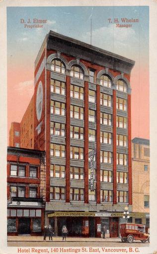 Keywords: architecture building "Hotel Regent, 140 Hastings St. East, Vancouver, B. C. D. J. Elmer Proprietor T. H. Whelan Manager" Post Card. Novelty Manufacturing & Art Co., Ltd., Montreal. Regent Hotel, 160 East Hastings Street, Vancouver, BC. Built 1913. Extant. "This late 19th-Century Chicago style building shows, in its arched verticle pier-and-spandrel rhythm, the influence, if not the sophistication, of the great American architect Louis Henry Sullivan. It is effective, nevertheless, as part of the Downtown Eastside's varied early 1900s streetscape." [From Exploring Vancouver: The Essential Architectural Guide by Harold Kalman (UBC Press, 1993)] "Hotel Regent, 140 Hastings St. East, Vancouver, B. C. D. J. Elmer Proprietor T. H. Whelan Manager" Post Card. Novelty Manufacturing & Art Co., Ltd., Montreal. Regent Hotel, 160 East Hastings Street, Vancouver, BC. Built 1913. Extant. "This late 19th-Century Chicago style building shows, in its arched verticle pier-and-spandrel rhythm, the influence, if not the sophistication, of the great American architect Louis Henry Sullivan. It is effective, nevertheless, as part of the Downtown Eastside's varied early 1900s streetscape." [From Exploring Vancouver: The Essential Architectural Guide by Harold Kalman (UBC Press, 1993)] |