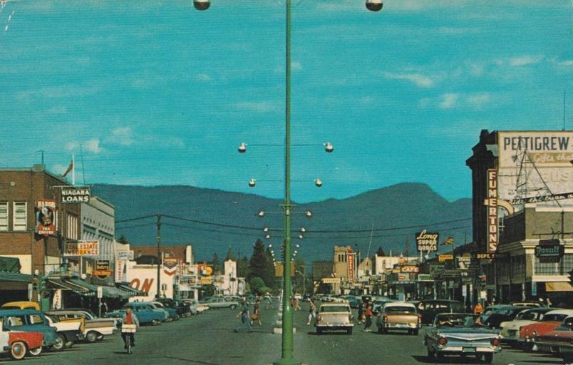 | Keywords: outdoor "Kelowna, B.C." Photography by W. J. Gibbons, A. M. P. A. Card No. BC-5. Post Card. Published by Gibbons Pacific Color Service, Vancouver, Canada - Format & Design Copyright 1953 - The Keystone Press Ltd., Vancouver, Canada, 1960. View looking west into the 400-block of Bernard Avenue from the intersection at Pandosy Street in Kelowna, BC. "Kelowna, B.C." Photography by W. J. Gibbons, A. M. P. A. Card No. BC-5. Post Card. Published by Gibbons Pacific Color Service, Vancouver, Canada - Format & Design Copyright 1953 - The Keystone Press Ltd., Vancouver, Canada, 1960. View looking west into the 400-block of Bernard Avenue from the intersection at Pandosy Street in Kelowna, BC. |