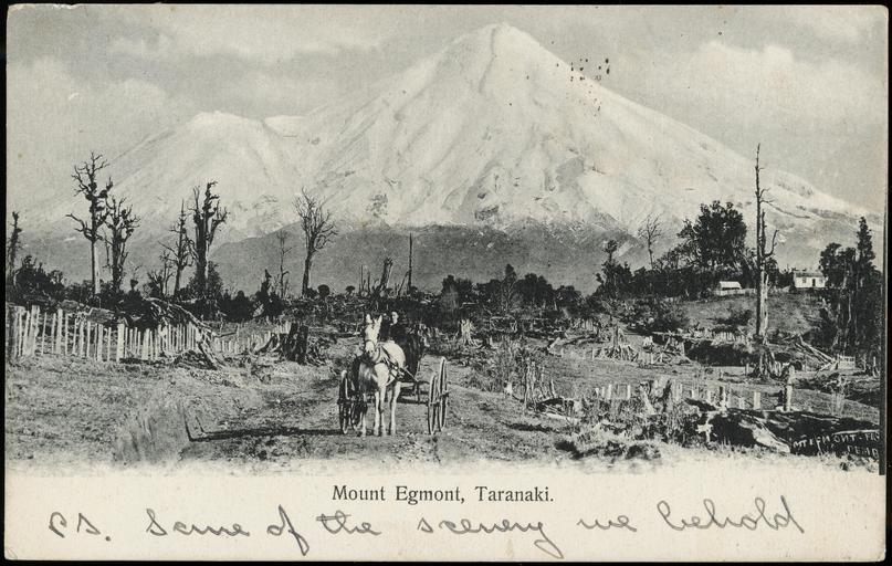 | Keywords: outdoor photo border snow Shows a view of Mount Taranaki from a dirt road, along which a horse and cart are approaching. There are fenced paddocks, signs of land clearing, and a farmhouse at the far right. Inscriptions: Inscribed - Verso - top right: [Rubber post stamp]: New Plymouth, 16 My '05, N.Z.. Quantity: 1 b&w photo-mechanical print(s) on postcard.. Physical Description: Black and white photolithograph on postcard, 88 x 138 mm. Provenance: Donated by Mr Charles Taylor in 1981. [Postcard]. Mount Egmont, Taranaki. [ca 1905]. [Postcard album of cards collected by Joye Taylor and her mother. ca 1951-1960, and 1904-1910].. Ref: Eph-B-POSTCARD-Vol-5-037-btm. Alexander Turnbull Library, Wellington, New Zealand. natlib.govt.nz/records/23074253 Shows a view of Mount Taranaki from a dirt road, along which a horse and cart are approaching. There are fenced paddocks, signs of land clearing, and a farmhouse at the far right. Inscriptions: Inscribed - Verso - top right: [Rubber post stamp]: New Plymouth, 16 My '05, N.Z.. Quantity: 1 b&w photo-mechanical print(s) on postcard.. Physical Description: Black and white photolithograph on postcard, 88 x 138 mm. Provenance: Donated by Mr Charles Taylor in 1981. [Postcard]. Mount Egmont, Taranaki. [ca 1905]. [Postcard album of cards collected by Joye Taylor and her mother. ca 1951-1960, and 1904-1910].. Ref: Eph-B-POSTCARD-Vol-5-037-btm. Alexander Turnbull Library, Wellington, New Zealand. natlib.govt.nz/records/23074253 |