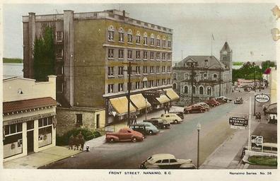 Keywords: photo border outdoor "Front Street, Nanaimo, B. C. Nanaimo Series No. 38" Post Card. This is a Real Photograph. Hand Coloured. Copyright, J. Fred Spalding. Published by The Camera Products Co., 1731, Dunbar Street, Vancouver, B.C. Made in England. Southerly view into the 000-block of Front Street in Nanaimo, BC on Vancouver Island. Visible is the Hotel Malaspina (1927-1996; center) and the Post Office building (right). "Front Street, Nanaimo, B. C. Nanaimo Series No. 38" Post Card. This is a Real Photograph. Hand Coloured. Copyright, J. Fred Spalding. Published by The Camera Products Co., 1731, Dunbar Street, Vancouver, B.C. Made in England. Southerly view into the 000-block of Front Street in Nanaimo, BC on Vancouver Island. Visible is the Hotel Malaspina (1927-1996; center) and the Post Office building (right). |