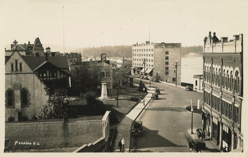 Keywords: outdoor "Nanaimo B.C." AZO Post Card. Made in Canada. View looking NE up the 000-block of Church Street towards the intersection at Front Street in Nanaimo, BC on Vancouver Island. Visible is St. Paul's Anglican Church, the Courthouse, the War Memorial, the Hotel Malaspina and the Hotel Windsor. "Nanaimo B.C." AZO Post Card. Made in Canada. View looking NE up the 000-block of Church Street towards the intersection at Front Street in Nanaimo, BC on Vancouver Island. Visible is St. Paul's Anglican Church, the Courthouse, the War Memorial, the Hotel Malaspina and the Hotel Windsor. |