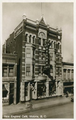 Keywords: architecture building photo border "New England Café, Victoria, B. C." Post Card. Copyright, Canada, Leonard Frank. Importex Company, Vancouver, B.C. Real Photograph. Imprimé en Allemagne. New England Hotel & Cafe Ltd., 1312 Government Street, Victoria, BC. Harry Wille, manager. Phones 161 & 3477-0 (1930). Built 1892; extant. Architect: John Teague. "New England Café, Victoria, B. C." Post Card. Copyright, Canada, Leonard Frank. Importex Company, Vancouver, B.C. Real Photograph. Imprimé en Allemagne. New England Hotel & Cafe Ltd., 1312 Government Street, Victoria, BC. Harry Wille, manager. Phones 161 & 3477-0 (1930). Built 1892; extant. Architect: John Teague. |