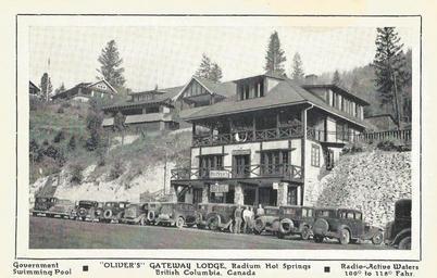 | Keywords: photo border outdoor ""OLIVER'S" GATEWAY LODGE, Radium Hot Springs British Columbia, Canada Government Swimming Pool • Radio-Active Waters 100° to 118° Fahr." Post Card. Printed in Canada on Canadian Paper. GUEST You are welcome here, / Be at your ease: Get up when you're ready, / Go to bed when you please. Happy to share with you / Such as we've got— The leaks in the roof, / The soup in the pot. You don't have to thank us / Or laugh at our jokes; Sit deep, and come often, / You're one of the folks. Located on the Kootenay Highway (Hwy. 93) next to the old gateway to Kootenay National Park. The park gateway was relocated in 1954 when increased traffic volume to the park caused the old entranceway to be out-grown. ""OLIVER'S" GATEWAY LODGE, Radium Hot Springs British Columbia, Canada Government Swimming Pool • Radio-Active Waters 100° to 118° Fahr." Post Card. Printed in Canada on Canadian Paper. GUEST You are welcome here, / Be at your ease: Get up when you're ready, / Go to bed when you please. Happy to share with you / Such as we've got— The leaks in the roof, / The soup in the pot. You don't have to thank us / Or laugh at our jokes; Sit deep, and come often, / You're one of the folks. Located on the Kootenay Highway (Hwy. 93) next to the old gateway to Kootenay National Park. The park gateway was relocated in 1954 when increased traffic volume to the park caused the old entranceway to be out-grown. |