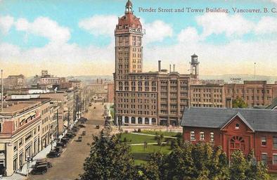 | Keywords: outdoor architecture building skyline city "Pender Street and Tower Building, Vancouver, B. C. Copyright" Post Card. Published by The Coast Publishing Co., Vancouver, B. C. Made in U S A. View looking east down West Pender Street from the intersection at Cambie Street in Vancouver, BC. The Sun Tower, 500 Beatty Street at West Pender Street, Vancouver, BC: Built 1911-12; extant. Originally called the World Building, Bekins Moving and Storage Company became its tenant from 1924 to 1937. It then became home of the Vancouver Sun newspaper (1937-65) where it became known as the Sun Tower. At the lower right is the former City Hospital (1889 addition) at 530 Cambie Street. "Pender Street and Tower Building, Vancouver, B. C. Copyright" Post Card. Published by The Coast Publishing Co., Vancouver, B. C. Made in U S A. View looking east down West Pender Street from the intersection at Cambie Street in Vancouver, BC. The Sun Tower, 500 Beatty Street at West Pender Street, Vancouver, BC: Built 1911-12; extant. Originally called the World Building, Bekins Moving and Storage Company became its tenant from 1924 to 1937. It then became home of the Vancouver Sun newspaper (1937-65) where it became known as the Sun Tower. At the lower right is the former City Hospital (1889 addition) at 530 Cambie Street. |