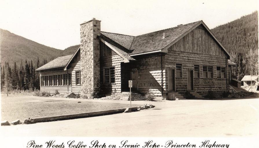 Keywords: architecture outdoor building monochrome "Pine Woods Coffee Shop on Scenic Hope-Princeton Highway" Pine Woods Lodge on Hope-Princeton Highway, Manning Park, British Columbia, Canada. "Pinewoods Lodge Ltd.: This large rustic lodge in the heart of the park has restaurant and dining room facilities. See the wood carvings in the lounge. Twelve first class motel units and a number of cheaper "family" cabins are operated in conjunction with it. There also is an Esso service station. Horses are kept for hire and, in winter, a ski tow and skating rink cater to holidayers." [From: Milestones in Ogopogo Land by C.P. Lyons (Evergreen Press, 1957)] "Pine Woods Coffee Shop on Scenic Hope-Princeton Highway" Pine Woods Lodge on Hope-Princeton Highway, Manning Park, British Columbia, Canada. "Pinewoods Lodge Ltd.: This large rustic lodge in the heart of the park has restaurant and dining room facilities. See the wood carvings in the lounge. Twelve first class motel units and a number of cheaper "family" cabins are operated in conjunction with it. There also is an Esso service station. Horses are kept for hire and, in winter, a ski tow and skating rink cater to holidayers." [From: Milestones in Ogopogo Land by C.P. Lyons (Evergreen Press, 1957)] |