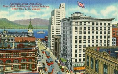 | Keywords: architecture city skyline skyscraper building complex outdoor building "Granville Street, Post Office, Royal Bank Building and Rogers Building, Vancouver, B. C., Canada" Post Card. Published by The Coast Publishing Co., Vancouver, B. C. Made in U.S.A. View looking north down Granville Street from the 500-block from the intersection at West Pender Street in Vancouver, BC. Rogers Building, 470 Granville Street (NE corner of Granville and West Pender Streets), Vancouver, BC. Built 1911-12. Architect: Gould and Champney. Royal Bank Building, 675 West Hastings Street (NE corner Granville and West Hastings Streets), Vancouver, BC. Built 1929-31. Architect: S.G. Davenport. "Granville Street, Post Office, Royal Bank Building and Rogers Building, Vancouver, B. C., Canada" Post Card. Published by The Coast Publishing Co., Vancouver, B. C. Made in U.S.A. View looking north down Granville Street from the 500-block from the intersection at West Pender Street in Vancouver, BC. Rogers Building, 470 Granville Street (NE corner of Granville and West Pender Streets), Vancouver, BC. Built 1911-12. Architect: Gould and Champney. Royal Bank Building, 675 West Hastings Street (NE corner Granville and West Hastings Streets), Vancouver, BC. Built 1929-31. Architect: S.G. Davenport. |