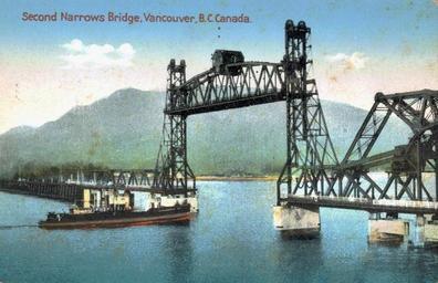 | Keywords: outdoor photo border water sea waterfront skyline "Second Narrows Bridge, Vancouver, B.C. Canada" Post Card. Published by the Coast Publishing Company, Vancouver, B.C. Imprimé en Allemagne. The rebuilt Second Narrows Bridge after June 18, 1934 with the bascule span cut back and the large span to the north rebuilt as a 280-foot vertical lift span, hoisted between two new steel towers. Originally built in 1925 but closed after severe damage in september 1930 (See below). "Second Narrows Bridge, Vancouver, B.C. Canada" Post Card. Published by the Coast Publishing Company, Vancouver, B.C. Imprimé en Allemagne. The rebuilt Second Narrows Bridge after June 18, 1934 with the bascule span cut back and the large span to the north rebuilt as a 280-foot vertical lift span, hoisted between two new steel towers. Originally built in 1925 but closed after severe damage in september 1930 (See below). |