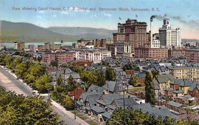 | Keywords: outdoor city architecture skyline "View showing Court House, C. P. R. Hotel and Vancouver Block, Vancouver, B. C." Post Card. Published by the Coast Publishing Company, Vancouver, B. C. View looking NE towards downtown Vancouver, likely from the spire of the First Baptist Church (built 1910-11; extant) at Burrard and Nelson Streets in Vancouver, BC. The intersection at the lower left is Burrard and Smithe Streets. "View showing Court House, C. P. R. Hotel and Vancouver Block, Vancouver, B. C." Post Card. Published by the Coast Publishing Company, Vancouver, B. C. View looking NE towards downtown Vancouver, likely from the spire of the First Baptist Church (built 1910-11; extant) at Burrard and Nelson Streets in Vancouver, BC. The intersection at the lower left is Burrard and Smithe Streets. |