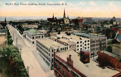 | Keywords: outdoor "Bird's Eye View, looking South, Vancouver, B. C." Post Card. Published by Novelty Post Card Co., Vancouver, B. C. Made in U. S. A. View looking south down Hamilton Street from the Dominion Trust Building at 207 West Hastings Street in Vancouver, BC. "Bird's Eye View, looking South, Vancouver, B. C." Post Card. Published by Novelty Post Card Co., Vancouver, B. C. Made in U. S. A. View looking south down Hamilton Street from the Dominion Trust Building at 207 West Hastings Street in Vancouver, BC. |