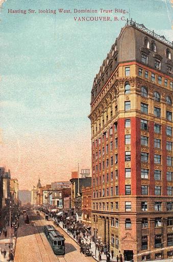 | Keywords: building architecture outdoor building complex city skyline skyscraper "Hastings Str. looking West, Dominion Trust Bldg., Vancouver, B. C." Private Post Card. European Import Co., Chromo-Serie No. 95. Dominion Building, 207 West Hastings Street (NW corner at Cambie Street) in Vancouver, BC. Built 1908-10; extant. Architects: J.S. Helyer and Son. View looking west down West Hastings Street from the intersection at Cambie Street in Vancouver, BC. "Hastings Str. looking West, Dominion Trust Bldg., Vancouver, B. C." Private Post Card. European Import Co., Chromo-Serie No. 95. Dominion Building, 207 West Hastings Street (NW corner at Cambie Street) in Vancouver, BC. Built 1908-10; extant. Architects: J.S. Helyer and Son. View looking west down West Hastings Street from the intersection at Cambie Street in Vancouver, BC. |
