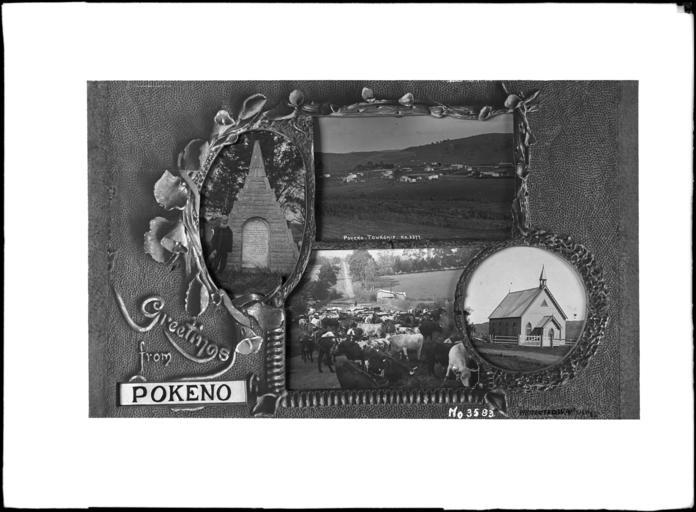 | Keywords: blackandwhite monochrome photo border black and white Four views of Pokeno encircled with leaves and other decorative borders. Photograph taken by William Archer Price between 1900 and 1930. Left: Stone memorial to commemorate officers and men who were killed in the district during the New Zealand Wars, 1863-1864. Those named on the memorial are: Richard Horton, Loader, William Smith, Liam Murphy, John Scott, Felix McGarth, James Merick [?], James Cassidy, Alexander Jamieson. Name at top is indecipherable. There is a man standing beside the memorial. Right: Pokeno Presbyterian Church Top: Pokeno township Bottom: Country road with herd of cows Inscriptions: Inscribed - Recto - bottom left: Greetings from PokenoPhotographer's title on negative -bottom right: No 3583. Quantity: 1 b&w original negative(s). Physical Description: Dry plate glass negative 4.5 x 6.5 inches Postcard with images of Pokeno. Price, William Archer, 1866-1948 :Collection of post card negatives. Ref: 1/2-000124-G. Alexander Turnbull Library, Wellington, New Zealand. natlib.govt.nz/records/22486063 Four views of Pokeno encircled with leaves and other decorative borders. Photograph taken by William Archer Price between 1900 and 1930. Left: Stone memorial to commemorate officers and men who were killed in the district during the New Zealand Wars, 1863-1864. Those named on the memorial are: Richard Horton, Loader, William Smith, Liam Murphy, John Scott, Felix McGarth, James Merick [?], James Cassidy, Alexander Jamieson. Name at top is indecipherable. There is a man standing beside the memorial. Right: Pokeno Presbyterian Church Top: Pokeno township Bottom: Country road with herd of cows Inscriptions: Inscribed - Recto - bottom left: Greetings from PokenoPhotographer's title on negative -bottom right: No 3583. Quantity: 1 b&w original negative(s). Physical Description: Dry plate glass negative 4.5 x 6.5 inches Postcard with images of Pokeno. Price, William Archer, 1866-1948 :Collection of post card negatives. Ref: 1/2-000124-G. Alexander Turnbull Library, Wellington, New Zealand. natlib.govt.nz/records/22486063 |