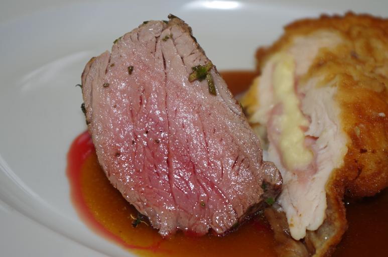 Keywords: potatoes pork sauce plate serving steak meal lunch