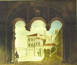 | Keywords: Poteshny dvorets.jpg ru Вид Потешного дво ца в осковском К емле че ез а ку Львиных во от Аква ель Ф Г Солнцева 1840-х гг по исунку неизвестного художника //Рихте Ф Памятники д евнего усского зодчества 1851-56 С 4 en Moscow the Kremlin The Poteshny Palace http //www archi ru/lib/publication html id 1850569765 fl 5 sl 1 s 1840 author PD-Old Amusement Palace Fedor Solntsev |
