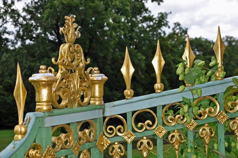 Keywords: potsdam brandenburg castle sanssouci baroque grid fence goal close detail green gold iron blacksmith lance great paint color ornament ranke hops protection defense light history art jewellery