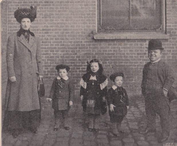 | Keywords: Potsenmakertje.png nl Wie monsieur Manie meer bekend als Kleine Jacob 't lichamelijk zoo benedenmatige potsenmakertje bij Carré in actie ziet zal bezwaarlijk vermoeden dat dit oolijke baasje er vrouw en kinderen op na houdt Toch is het zoo Op onze foto compareert het echtpaar met kroost Mevt Manie evenals haar gemaaltje uit Belgie geboortig verhuigt zich in een normale lengte en de naast haar staande kleine René 4 jaar en 't meisje Aline 6 jaar dreigen die mettertijd óók te zullen krijgen Maar Marcel de kleinste van de drie is al 8 jaar Dit leuke hukkepukkie belooft dus op 't stuk van grootte 'n waardig zoon van z'n papa en evenals deze door zijn kleinheid groot te worden - In een onderhoud met Monsieur Manie vernamen wij dat hij 38 jaar geleden te Charleroi werd geboren daar op 16-jarigen leeftijd zijn circus-loopbaan begon eenmaal op een fete Flamande met Prins Boudewijn ' n glas champagne dronk en in de meeste groote steden van Europa is opgetreden In 't gewone leven blijkt hij levenslustig vroolijk maar bovenal bescheiden te zijn Hij houdt zich niet grooter dan hij is schuwt alle grootdoenerij en minder dan tal van kunstenaars wier populariteit bij die van Kleine Jacob hopeloos in 't niet zinkt loopt hij gevaar aan grootheidswaanzin te zullen gaan laboreeren De prins der geillustreerde bladen V Leers PD-old De Prins der Geillustreerde Bladen |