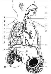 Keywords: Poumons3.jpg en Respiratory system 1 Parietal pleura - 2 Visceral pleura - 3 Primary bronchus - 4 Secondary bronchi - 5 Tertiary bronchi - 6 Bronchiole - 7 Pleural space - 8 Terminal bronchiole - 9 Pulmonary vein - 10 Alveolar sac - 11 Nasal cavity - 12 Pharynx - 13 Larynx - 14 Trachea - 15 Hilus - 16 Mediastinal surface - 17 Capillary - 18 Red blood cell - 19 Pulmonary artery - 20 Alveolar duct - 21 Alveolus PD-USGov Uploaded with UploadWizard Respiratory system Human anatomy |