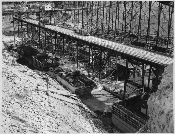 | Keywords: "Power house concrete blocks on west side, shown under the lower placing trestle." - NARA - 294299.jpg Scope and content Photograph from Volume Two of a series of photo albums documenting the construction of the Grand Coulee Dam and related work on the Columbia Basin Project General notes 294299 Local identifier Department of the Interior Bureau of Reclamation Engineering and Research Center 05/18/1981 - 03/04/1988 NARA's Rocky Mountain Region Denver NRGA Building 48 Denver Federal Center West 6th Avenue and Kipling Street Denver CO 80225-0307 1936-03-31 Record group Record Group 115 Records of the Bureau of Reclamation 1889 - 2008 Record group ARC 444 Photograph albums compiled 1903 - 1972 Series ARC 293611 File unit File unit ARC Variant control numbers NAIL Control Number NRG-115-CONSTPHO85006-COLBASIN21027 Other versions <gallery> File Power_house_concrete_blocks_on_west_side _shown_under_the_lower_placing_trestle _-_NARA_-_294299 tif tif File Power_house_concrete_blocks_on_west_side _shown_under_the_lower_placing_trestle _-_NARA_-_294299 jpg jpg </gallery> NARA-cooperation PD-USGov Construction of the Grand Coulee Dam |