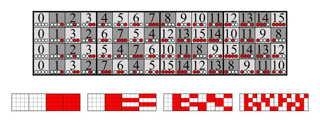 | Keywords: Powers of 4-bit Gray code permutation.svg  The four different powers of the 4-bit Gray code permutation top left 4x16 submatrix of A195467 The dual matrix below shows the single binary digits of each number <br> The binary matrix on the right is the top left 4x16 submatrix of A197819 <br> The binary matrices on the left are always the left half of their right neighbour streched to double lenghth Two permutations of the numbers 0 15 are visible in this file Both are Walsh permutations The rightmost binary matrix describes the symmetric permutation 0 15 10 5 12 3 6 9 8 7 2 13 4 11 14 1 <br>which is wp 1 3 5 15 300px left <br clear all> The matrix entries with odd binary digit sum white background describe the permutation 0 15 5 10 9 6 12 3 1 14 4 11 8 7 13 2 <br>which is wp 15 1 3 5 300px left own mate2code Gray code 4-bit Walsh permutation Dual matrix in binary Cyclic groups 4×16 matrices |