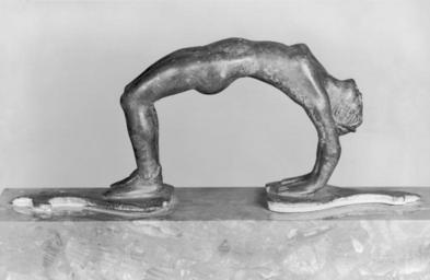 | Keywords: Praenestine - Cista Handle in the Form of a Woman Somersaulting - Walters 54101.jpg Cistae were containers used to safeguard precious objects including mirrors perfume flasks and cosmetics A particular type of cista was made during the 4th and 3rd centuries BC in Praeneste a site in Latium the region around Rome that was heavily influenced by Etruscan culture The elaborately engraved scenes are thought to imitate famous but now lost Greek wall-paintings The ancient metalworker often pressed a white substance into the engraved lines in order to accentuate the decoration The handles commonly take the form of human figures Many artists in other early Italian cultures similarly incorporated figures of humans in functional objects This female athlete performs a somersault She wears only a diadem headband and shoes Etruscans loved to incorporate human figures including those of athletes into their everyday objects century 5 4 BC bronze cm 7 1 17 7 4 6 accession number 54 101 8481 Joseph Brummer Henry Walters city Baltimore Walters Art Museum Henry Walters Acquired by Henry Walters 1924 place of origin Latium in present-day Italy Walters Art Museum license Ancient Roman sculptures in the Walters Art Museum Praenestine art Gymnastics in art Statues of ancient Greek and Roman athletes Etruscan dance beeld |