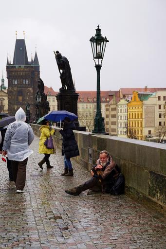 Keywords: prague bridge carlo rain bad weather gray bridges stone man homeless stone bridge lamppost sky abandonment affection dog winter city passers by cold sadness solitude statue help solidarity