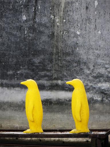 Keywords: prague penguins yellow wall structure grunge czech republic animals figures statue sculpture bright plastic lamp lights illuminated river