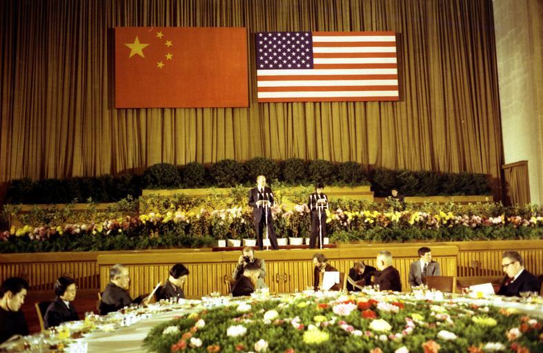 | Keywords: President Ford makes remarks in the People's Republic of China - NARA - 7062599.jpg This photograph depicts President Ford making remarks at a Reciprocal Dinner in honor of the People's Republic of China PRC Official Party that he and First Lady Betty Ford hosted in the Peking Room of the Great Hall of the People 7062599 Creator Karl Schumacher Gerald R Ford Presidential Library http //www fordlibrarymuseum gov/avproj/State_Trips_PRC asp A7580-04A Institution Gerald R Ford Presidential Library 1975-12-04 Gerald R Ford Presidential Library and Museum-cooperation PD-USGov Uploaded with UploadWizard 1975 State Visit to China photo kit at the Gerald R Ford Presidential Library 1975 in China Relations of the People's Republic of China and the United States Gerald Ford in 1975 Public speaking Interior of Great Hall of the People Photographs of flags of the People's Republic of China Photographs of flags of the United States Flags in China State dinners |