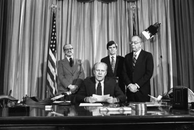 | Keywords: President Ford signs emergency appropriations legislation for the National Swine Flu Immunization Program - NARA - 7064720.jpg This photograph depicts President Gerald Ford making remarks upon signing emergency appropriations legislation House Joint Resolution 890 Public Law 94-266 for the National Swine Flu Immunization Program Also present are l-r U S Representative Dan Flood D-PA Department of Health Education and Welfare HEW Secretary F David Mathews and U S Representative Paul G Rogers D-FL 7064720 Creator William Fitz-Patrick Gerald R Ford Presidential Library http //www fordlibrarymuseum gov/avproj/swineflu asp A9259-15 Institution Gerald R Ford Presidential Library 1976-04-15 Gerald R Ford Presidential Library and Museum-cooperation PD-USGov Uploaded with UploadWizard Swine Flu Program photo kit at the Gerald R Ford Presidential Library National Swine Flu Immunization Program Gerald Ford in 1976 Public speaking in the United States Dan Flood F David Mathews Paul G Rogers Photographs by William Fitz-Patrick |