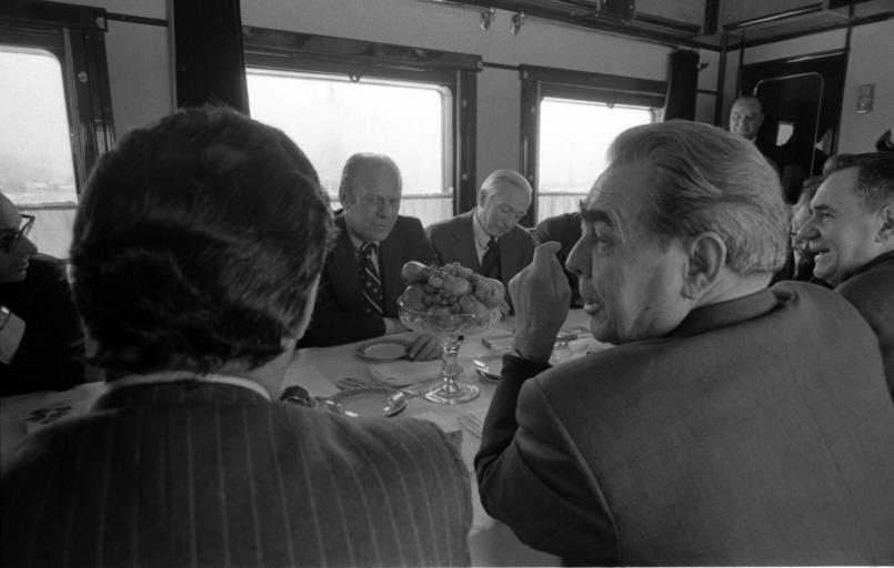| Keywords: President Ford travels to the Vladivostok Summit Meeting, 1974 - NARA - 7158147.jpg Photograph of the American Official Party and the Soviet Welcoming Committee traveling by train from Vozdvizhenka Airport to the site of the Summit Meetings on Arms Control at Okeansky Sanatorium Vladivostok U S S R 7158147 Creator David Hume Kennerly Gerald R Ford Presidential Library http //www fordlibrarymuseum gov/library/exhibits/vladivostok/varrival asp A2107-36A Institution Gerald R Ford Presidential Library 1974-11-23 Gerald R Ford Presidential Library and Museum-cooperation PD-USGov Uploaded with UploadWizard 1974 State Visit to the USSR photo kit at the Gerald R Ford Presidential Library 1974 in Vladivostok Rail transport in the Soviet Union Gerald Ford in 1974 Gerald Ford and Leonid Brezhnev Photographs by David Hume Kennerly from 1974 |