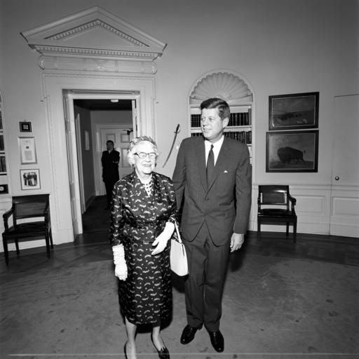 Keywords: u.s. national archives usnationalarchives jfk presidential library jfkpresidentiallibrary white house whitehouse jfk john kennedy blackandwhite people monochrome black and white Original Caption: President John F. Kennedy with Newspaper Publisher We are looking for your help in identifying unknown people in our White House Photographs collection. If you have any information about this photograph, please post a comment, including any relevant sources, for the catalogers at the John F. Kennedy Presidential Library. Thank you! Local Identifier: JFKWHP-ST-235-3-62 Created By: President (1961-1963 : Kennedy). Office of the Naval Aide to the President. (1961 - 1963) From: President (1963-1969 : Johnson). White House Photograph Office. (1963 - 1969) Contact: John F. Kennedy Library (LP-JFK), Columbia Point Boston, MA 02125-3398 Phone: 617-514-1600 Fax: 617-514-1652 Email: kennedy.library@nara.gov Production Dates: 5/28/1962 Scope and Content Note: In this photograph, President John F. Kennedy stands with an unidentified woman during a visit with women newspaper publishers. Special Assistant to the President, Kenneth P. O’Donnell, stands in background (through doorway), Oval Office, White House, Washington, D.C. Persistent URL: JFK Library URL: www.jfklibrary.org/Asset-Viewer/Archives/JFKWHP-ST-235-3-... Access Restrictions: Unrestricted Use Restrictions: Unrestricted Original Caption: President John F. Kennedy with Newspaper Publisher We are looking for your help in identifying unknown people in our White House Photographs collection. If you have any information about this photograph, please post a comment, including any relevant sources, for the catalogers at the John F. Kennedy Presidential Library. Thank you! Local Identifier: JFKWHP-ST-235-3-62 Created By: President (1961-1963 : Kennedy). Office of the Naval Aide to the President. (1961 - 1963) From: President (1963-1969 : Johnson). White House Photograph Office. (1963 - 1969) Contact: John F. Kennedy Library (LP-JFK), Columbia Point Boston, MA 02125-3398 Phone: 617-514-1600 Fax: 617-514-1652 Email: kennedy.library@nara.gov Production Dates: 5/28/1962 Scope and Content Note: In this photograph, President John F. Kennedy stands with an unidentified woman during a visit with women newspaper publishers. Special Assistant to the President, Kenneth P. O’Donnell, stands in background (through doorway), Oval Office, White House, Washington, D.C. Persistent URL: JFK Library URL: www.jfklibrary.org/Asset-Viewer/Archives/JFKWHP-ST-235-3-... Access Restrictions: Unrestricted Use Restrictions: Unrestricted
