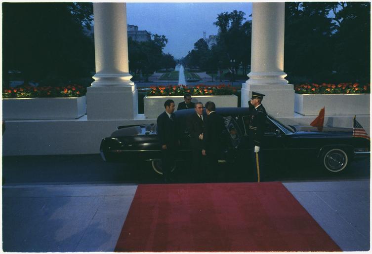 | Keywords: President Nixon greets General Secretary Brezhnev prior to State Dinner - NARA - 194516.tif Scope and content Pictured interpreter Leonid Brezhnev President Nixon Subject Heads of State - U S S R General notes 194516 Local identifier NLRN-WHPO-E1016C-01A General Services Administration National Archives and Records Service Office of Presidential Libraries Office of Presidential Papers 01/20/1969 - ca 12/1974 Most Recent <br /> President 1969-1974 Nixon White House Photo Office 1969 - 1974 Most Recent NARA-Author Kightlinger Jack E 1932-2009 Photographer 8451338 <br /> Richard Nixon Library NLRN 18001 Yorba Linda Boulevard Yorba Linda CA 92886 1973-06-18 Record group Collection RN-WHPO White House Photo Office Collection Nixon Administration 01/20/1969 - 08/09/1974 Record group ARC 1179 Nixon White House Photographs compiled 01/20/1969 - 08/09/1974 documenting the period 08/08/1968 - 08/09/1974 Series ARC 194277 File unit File unit ARC Variant control numbers NAIL Control Number NLNP-WHPO-MPF-E1016C 01A yes Other versions NARA-cooperation PD-USGov Leonid Brezhnev and Richard Nixon Leonid Brezhnev in 1973 Richard Nixon in 1973 |