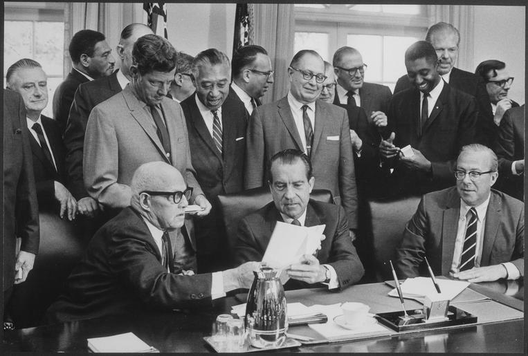 | Keywords: President Nixon signing Executive Order 11491, with labor leaders - NARA - 194659.tif Scope and content Pictured George Meany Richard M Nixon George Schultz Subject Labor General notes 194659 Local identifier NLRN-WHPO-2282-03A General Services Administration National Archives and Records Service Office of Presidential Libraries Office of Presidential Papers 01/20/1969 - ca 12/1974 Most Recent <br /> President 1969-1974 Nixon White House Photo Office 1969 - 1974 Most Recent NARA-Author Knudsen Robert L Robert LeRoy 1929-1989 Photographer 8451337 <br /> Richard Nixon Library NLRN 18001 Yorba Linda Boulevard Yorba Linda CA 92886 1969-10-29 Record group Collection RN-WHPO White House Photo Office Collection Nixon Administration 01/20/1969 - 08/09/1974 Record group ARC 1179 Nixon White House Photographs compiled 01/20/1969 - 08/09/1974 documenting the period 08/08/1968 - 08/09/1974 Series ARC 194277 File unit File unit ARC Variant control numbers NAIL Control Number NLNP-WHPO-MPF-2282 03A yes Other versions File Nixon and Meany 1969 cropped tif NARA-cooperation PD-USGov October 1969 in the United States Presidents of the United States signing executive orders Richard Nixon in 1969 George Meany George P Shultz Richard Nixon with people |