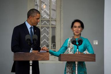 Keywords: President Obama and Aung San Suu Kyi Address the Media - Flickr - East Asia and Pacific Media Hub (3).jpg RANGOON Burma November 14 2014 President Barack Obama with Chairperson of the National League for Democracy and Member of Parliament Aung San Suu Kyi addresses the international media State Department photo by William Ng/Public Domain https //www flickr com/photos/eapmediahub/15167523363/ President Obama and Aung San Suu Kyi Address the Media 2014-11-14 15 09 https //www flickr com/people/56477391 N06 East Asia and Pacific Media Hub U S Department of State PD-USGov East Asia and Pacific Media Hub https //flickr com/photos/56477391 N06/15167523363 2016-11-27 04 17 48 United States Government Work Uncategorized 2016 November 27 Files_from_East_Asia_and_Pacific_Media_Hub_U S _Department_of_State_Flickr_stream Files_uploaded_by_Josve05a_ U S _DoS |