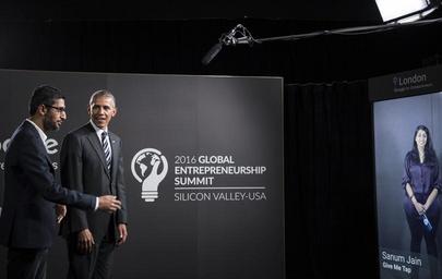 Keywords: global entrepreneurship summit globalentrepreneurshipsummit ges 2016 ges2016 silicon valley siliconvalley entrepreneurship innovators palo alto paloalto stanford university stanforduniversity california President Obama and Google CEO Sundar Pichai step inside the Google Portal at the seventh annual Global Entrepreneurship Summit (GES) at Stanford University in Palo Alto, California, on June 22-24, 2016. [GES Photo/Public Domain] President Obama and Google CEO Sundar Pichai step inside the Google Portal at the seventh annual Global Entrepreneurship Summit (GES) at Stanford University in Palo Alto, California, on June 22-24, 2016. [GES Photo/Public Domain]