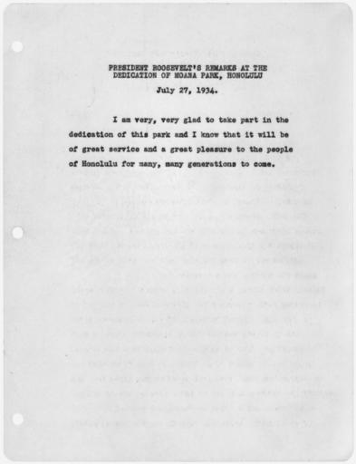 | Keywords: President Roosevelt's remarks at the dedication of Moana Park, Honolulu - NARA - 197463.jpg Scope and content General notes 197463 Local identifier President 1933-1945 Roosevelt 1933 - 1945 NARA-Author Roosevelt Franklin D Franklin Delano 1882-1945 Author 1301590 <br /> Honolulu Oahu Honolulu county Hawaii United States North and Central America inhabited place 4201560 21 3 -157 85 <br /> Franklin D Roosevelt Library NLFDR 4079 Albany Post Road Hyde Park NY 12538-1999 1934-07-27 Record group Collection FDR-PPF Papers as President President's Personal File 1933 - 1945 Record group ARC 1185 Speeches of President Franklin D Roosevelt compiled 1933 - 1945 Series ARC 197300 File unit First Carbon Files 1933 - 1945 File unit ARC 197301 Variant control numbers NAIL Control Number NLR-PPF-1820-1STCARBON-SA21 Other versions <gallery> File President_Roosevelt's_remarks_at_the_dedication_of_Moana_Park _Honolulu_-_NARA_-_197463 tif tif File President_Roosevelt's_remarks_at_the_dedication_of_Moana_Park _Honolulu_-_NARA_-_197463 jpg jpg </gallery> NARA-cooperation PD-USGov Documents related to Franklin Delano Roosevelt |