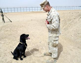 Keywords: Preventing the boom, Coalition forces IED train 120324-N-LS301-234.jpg en Crash an improvised explosive device detection dog waits for his reward after finding an improvised explosive device Crash works with his dog handler Cpl David Norris a native of Vacaville Calif an instructor of Reception Staging Onward movement and Integration course at Camp Leatherneck Afghanistan The two of them work on training exercises and physical exercise daily 2012-03-24 Petty Officer 3rd Class Monique LaRouche https //www dvidshub net/image/549168 120324-N-LS301-234 2012-03-27 09 16 CAMP LEATHERNECK AF PD-USGov-Military-Navy Camp Leatherneck Images from DoD uploaded by Fæ |
