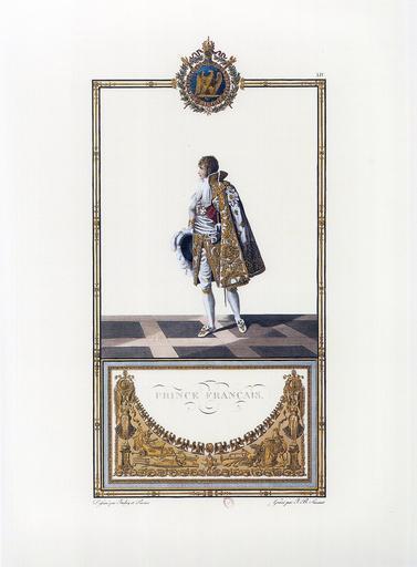 | Keywords: Prince français Isabey Percier Simonet livre du Sacre Napoleon.jpg Isabey et Percier gravure de Simonet pour les costumes du Sacre de Napoléon Ier Fac-simile du Livre du Sacre Paris 1805 Scan <small>Selon le titre III article 9 de la Famille Impériale de la Constitution du 28 floréal an XII les membres mâles de la famille de Napoléon portaient le titre de Prince Français</small> Légende Habillement d'un prince français Manteau habit et culotte de velours blanc; le manteau et les broderies semés d'abeilles d'or; la plaque de la Légion sur l'habit et le manteau La cravate de dentelle; le grand collier et la grand'croix de l'ordre Chapeau de feutre noir orné de plumes blanches; ganse en diamans Souliers de soie blanche grodés d'or; la rosette de drap d'or Isabey Percier engraving by Simonet for the official costumes of the coronation of Emperor Napoleon Fac simile of the Livre du Sacre Book of the Coronation Paris 1805 Scan <small>According to the Constitution the male members of the family of Napoleon had the title of Prince Français </small> 2012-02-12 own Jebulon QualityImage PD-scan cc-zero Uploaded with UploadWizard Recipients of the Legion of Honour Legion of Honour in heraldry Coats of arms of the Empire of France 19th-century drawings Drawings of clothing Jean-Baptiste Isabey Charles Percier Quality images by Jebulon Jean-Baptiste Simonet |