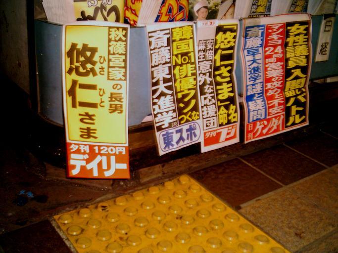 Keywords: Prince Hisahito of Akishino Newspaper 2006-9-12 02.jpg Japanese newspapers in Tokyo announcing the birth of the third in line Prince Hisahito of Akishino in September 2006 悠仁様命名を える夕刊紙 京の新聞スタンド photography person kisi 2006-09-12 Kici Newspaper stands in Japan September 2006 in Japan Prince Hisahito of Akishino Daily Sports Names in Japanese Furigana hiragana |