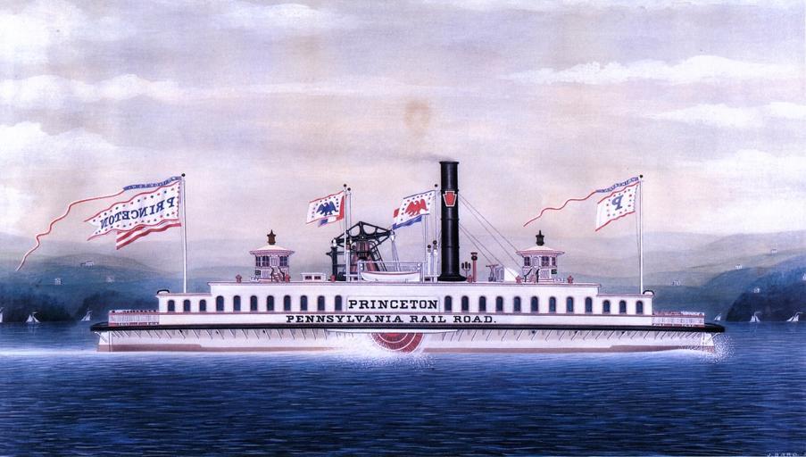 Keywords: Princeton (steam ferry 1880).jpg en Princeton steam ferry built 1880 served on the Delaware River from 1880 to 1906 under ownership of Pennsylvania Railroad Was repainted boxcar red in 1882 two years after this oil on canvas work by James Bard http //www the-athenaeum org/ The Athenaeum org Creator James Bard 1882 Original was in a private collection as of 1997 Reproduced in Mariner's Museum and Peluso Anthony J Jr The Bard Brothers -- Painting America under Steam and Sail Abrams New York 1997 ISBN 0-8109-1240-6 In particular this book reproduces larger images of the background vessels Peter G Coffin and Isaac P Smith PD-old-100 Princeton ship 1880 Images from the-athenaeum org |