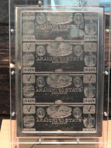 | Keywords: Printing plate - Indiana State Museum - DSC00419.JPG Printing plate for 5 banknotes from the State of Indiana circa 1840 Indiana State Museum 650 West Washington Street Indianapolis Indiana USA I took this photograph 2011-03-31 16 50 30 Daderot Public domain Indiana State Museum Printing plates Money of Indiana |