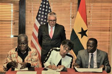 Keywords: Pritzker Cretz Accra 2014-05-20 P03 B001b.jpg en The representatives of the governments of the United States of America and the Republic of Ghana sign a Memorandum of Understanding MoU for the future cooperation at the energy sector <br /> person standing in the background Gene A Cretz U S Ambassador to Ghana<br /> person sitting in the foreground left <br /> person sitting in the foreground middle Penny Sue Pritzker U S Secretary of Commerce <br /> person sitting in the foreground right Emmanuel Buah Minister for Energy of the Republic of Ghana <br /> Location Accra https //www facebook com/USEmbassyGhana/photos/a 568773119905108 1073741928 146328372149587/568773359905084/ type 3 theater Facebook profile of the US Embassy in Ghana official photographer of the US government 2014-05-20 Accra in 2014 Visit of the Secretary of Commerce of the United States to Ghana Mai 2014 Gene Cretz Governments of the Fourth Republic of Ghana Government ministers of Ghana PD-USGov This photo was publicised by the US Embassy in Ghana with the license public <br /> PD-GHAGov This photo shows state authorities of the Republic of Ghana on a public photo |