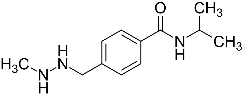 | Keywords: Procarbazine 200.svg validSVG Structure of N-isopropyl-4- 2-methylhydrazinyl methyl benzamide Own 2014-05-11 Emeldir <span class signature-talk >talk</span> Chemical structure verified https //upload wikimedia org/wikipedia/commons/a/af/Procarbazine_200 svg 1S/C12H19N3O/c1-9 2 15-12 16 11-6-4-10 5-7-11 8-14-13-3/h4-7 9 13-14H 8H2 1-3H3 H 15 16 CPTBDICYNRMXFX-UHFFFAOYSA-N 671-16-9 Synonyms <small><nowiki>N-Isopropyl-a- 2-methylhydrazino -p-toluamide hydrochloride Benzamide N- 1-methylethyl -4- 2-methylhydrazinyl methyl- BRN 0958270 CB 400-497 CCRIS 2389 HSDB 3250 Ibenzmethyzin Ibenzmethyzin Hydrochloride Matulane MIH N- 1-Methylethyl -4- 2-methylhydrazino methylbenzamide n-ISOPROPYL-alpha- 2-METHYLHYDRAZINO -para-TOLUAMIDE Natulan NSC-77213 PCX Procarbazina Procarbazina hidrocloruro de Procarbazine Procarbazine Hydrochloride Procarbazinum Ro 4-6467/1 Ro-4-6467 Ro-4-6467/1</nowiki></small> PD-chem Procarbazine |