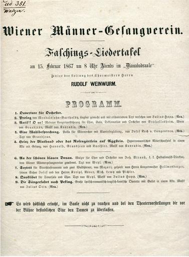 | Keywords: Programm Faschings-Liedertafel-1867-Donauwalzer.jpg en Original Program of the Premiere from An der schönen blauen Donau de Original-Programm der Premiere von žAn der schönen blauen Donau Wienbibliothek http //www wienbibliothek at/bestaende-und-sammlungen/druckschriftensammlung/neuerwerbungen/oktober10 html Neuerwerbungen Oktober 2010 - Donauwalzer im Dianabad The Kallir Family Collection Author 1867 Information field Transcription <center>Wiener Männer-Gesangverein<br/>Faschings-Liedertafel<br/>am 15 Februar 1867 um 8 Uhr Abends im žDianabadsaale <br/>unter der Leitung des Chormeisters Herrn<br/>RUDOLF WEINWURM<br/>- - - -<br/>PROGRAMM</center><br/>1 Ouverture für Orchester <br/>2 Prolog von Mendelssohn-Bartholdy singbar gemacht und mit erläuterndem Text versehen von Julius Hopp Neu <br/>3 Antik O ne Moderne Konzertaufführung für Chor Solo Deklamation und Orchester von Sophoklesheim Worte von Grandjean Musik von Konradin Neu <br/>4 Eine Wahlbesprechung Polka für Männerchor mit Klavierbegleitung von Josef Koch v Langentreu Neu Text von Grandjean <br/>5 Heinz der Bluthund oder das Rosengärtlein auf Aggstein Hyperromantisches Ritterschauspiel in einem Akte mit Gesang von Hannold Grandjean und Kneißler Musik von Konradin Neu <br/><center>- - - -</center><br/>6 An der schönen blauen Donau Walzer für Chor und Orchester von Joh Strauß k k Hofballmusik-Direktor dem Wiener Männergesangvereine gewidmet Text von Weyl Neu <br/>7 Sextett für Streichinstrumente und zwei Waldhörner von Mozart gespielt von Herrn Konzertmeister Hellmesberger seinem Sohne Josef und den Herren Kreipl Röver Rich Lewy und Pichler <br/>8 Quodlibet für Tenorsolo und Chor Text von Weyl Musik von Julius Hopp Neu <br/>9 Die Sängerfahrt nach Peking Große lyrisch-komische Operette mit Ballet in einem Akte Musik von Julius Otto Neu <br/><center>- - - -</center><br/>Es wird höflichst ersucht im Saale nicht zu rauchen und bei den Theatervorstellungen die vor der Bühne befindlichen Sitze den Damen zu überlassen An der schönen blauen Donau PD-old |
