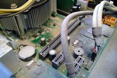 | Keywords: clay dust claydust dirty dusty fujitsu esprimo fujitsuesprimo motherboard project 365 project365 I got a call this morning to one of the art rooms, where the teacher reported that his computer was 'on the blink'.  This room gets used a lot for clay work and has a reputation amongst the cleaners as the room you really, really don't want.  The dust filled atmosphere just kills equipment, but even I was surprised when I opened this to find a motherboard looking the Sahara.  I broke out a Henry and between us managed to resuscitate the beast, with Dave clearing the main motherboard power coupling doing the best and most effective work.  Ew. I got a call this morning to one of the art rooms, where the teacher reported that his computer was 'on the blink'.  This room gets used a lot for clay work and has a reputation amongst the cleaners as the room you really, really don't want.  The dust filled atmosphere just kills equipment, but even I was surprised when I opened this to find a motherboard looking the Sahara.  I broke out a Henry and between us managed to resuscitate the beast, with Dave clearing the main motherboard power coupling doing the best and most effective work.  Ew. |