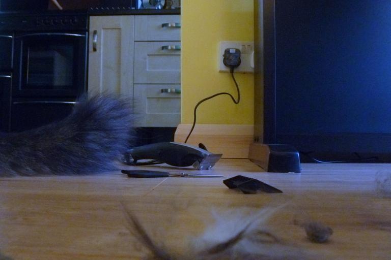 | Keywords: clipper fur pet grooming petgrooming project 366 project366 socks the cat socksthecat indoor This afternoon saw a trip to Dave and Carol's to help with a little grooming problem. Poor Socks has got this huge lump of matted fur on her chest and it would never, ever brush out. Time to get in there with the clippers. This is post clipping session, and you can see the clippers in frame with some loose fur and a fairly chilled kitty having some treats. The compact seems to have had an absolutely torrid time with this photo and it's under exposed and noisy as hell. Laura had her proper camera with her so may have fared rather better. :) This afternoon saw a trip to Dave and Carol's to help with a little grooming problem. Poor Socks has got this huge lump of matted fur on her chest and it would never, ever brush out. Time to get in there with the clippers. This is post clipping session, and you can see the clippers in frame with some loose fur and a fairly chilled kitty having some treats. The compact seems to have had an absolutely torrid time with this photo and it's under exposed and noisy as hell. Laura had her proper camera with her so may have fared rather better. :) |