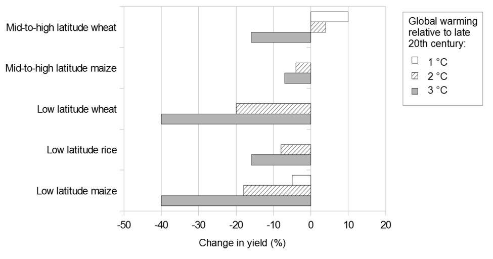| Keywords: Projected changes in crop yields at different latitudes with global warming.png  crop yields at different latitudes with global warming Projected changes are shown for 1-3 Â°C of global warming relative to late 20th century For mid-to-high latitudes changes in yield are shown for wheat and maize For low-latitudes changes are shown for wheat rice and maize In mid-to-high latitudes wheat yields increase for warming of 1-2 Â°C Yields decrease at 3 Â°C maize yields are unchanged for 1 Â°C of warming Yields decrease at 2-3 Â°C In low latitudes wheat and rice yields are unchanged at 1 Â°C They decrease at 2-3 Â°C maize yields decrease at 1-3 Â°C Data Values are approximate and are taken from the US National Research Council US NRC 2011 <ref name figure 5 1 > http //www nap edu/openbook php record_id 12877 page 161 Figure 5 1 p 161 in harvnb US NRC 2011 </ref> The first second and third numbers are the projected changes in yields for 1 2 and 3 Â°C of global warming respectively Mid-to-high latitude wheat +10 +4 -16 Mid-to-high latitude maize 0 -4 -7 Low latitude wheat 0 -20 -40 Low latitude rice 0 -8 -16 Low latitude maize -5 -18 -40 US NRC 2011 <ref name figure 5 1 /> drew on several studies The graph does not show the likely ranges included in US NRC 2011 <ref name figure 5 1 /> The likely range means that there is a 67 chance of the projected change in yield being correct based on expert judgement <ref name figure 5 1 /> For 1 Â°C of global warming the likely range is roughly equal to plus or minus +/- 10 for all projected changes in yields Uncertainty increases with temperature For 3 Â°C of warming the likely range is roughly +/- 10 for mid-to-high latitude wheat mid-to-high latitude maize and low-latitude rice; +/- 20 for low-latitude wheat and low-latitude maize These projections broadly show the probable changes in regional yields <ref name us nrc text > http //www nap edu/openbook php record_id 12877 page 160 pp 160-162 in US NRC 2011 </ref> The projections do not include measures to adapt to global warming <ref name us nrc text /> Actual changes in yields may vary according to local conditions <ref name us nrc text /> There are numerous other uncertainties including how local climate will change with global warming and the atmospheric concentration of carbon dioxide CO<sub>2</sub> associated with different magnitudes of global warming <ref name us nrc text /> There is also the possibility that yields will change if critical thresholds are crossed <ref name us nrc text /> Many of the uncertainties could bias the projections towards underestimating reductions in crop yields <ref name us nrc text /> However adaptation practices could help to reduce losses in yields <ref name us nrc text /> Adaptation will be more difficult for higher magnitudes of warming and may be less effective in tropical regions <ref name us nrc text /> Notes reflist References citation CITEREFUS NRC2011 US NRC 2011 Climate Stabilization Targets Emissions Concentrations and Impacts over Decades to Millennia Sec 5 1 FOOD PRODUCTION PRICES AND HUNGER in Ch 5 Impacts in the Next Few Decades and Coming Centuries http //www nap edu/openbook php record_id 12877 page 159 http //www nap edu/catalog php record_id 12877 National Academies Press Washington D C USA own Enescot 2013-07-14 Comma-separated values Data were exported from OpenOffice org 3 4 1 Calc as comma-separated values csv The following options were used Character set Western Europe 1252 Field delimiter Text delimiter Quote all text cells no Save cell content as shown yes Fixed column width no <pre> Global warming relative to late 20th century Region and crop 1 2 3 Mid-to-high latitude wheat 10 4 -16 Changes in yield Mid-to-high latitude maize 0 -4 -7 Low latitude wheat 0 -20 -40 Low latitude rice 0 -8 -16 Low latitude maize -5 -18 -40 </pre> Global warming graphs Agriculture Cc-zero  |