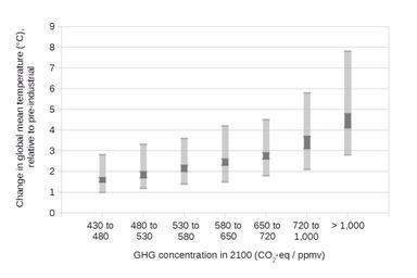 Keywords: Projected global warming in 2100 for a range of emission scenarios.png pre-industrial times in the year 2100 for a range of scenarios Pre-industrial times are approximated as the years 1850 to 1900 7 sets of temperature projections are given for different atmospheric concentrations of greenhouse gases measured in parts per million of carbon dioxide equivalents in the year 2100 On the graph the dark grey area of the bar shows 10th to 90th percentile range of median estimates while the light grey area of the bar shows the 16th to 84th percentile range of the full distribution of results Graph data is tabulated in a later section References citation 2014 IPCC AR5 WG3 CITEREFIPCC AR5 WG3 Edenhofer O et al Climate Change 2014 Mitigation of Climate Change Contribution of Working Group III WG3 to the Fifth Assessment Report AR5 of the Intergovernmental Panel on Climate Change IPCC http //mitigation2014 org/report/final-draft/ Cambridge University Press harv Archived https //web archive org/web/20140629152007/http //mitigation2014 org/report/final-draft 29 June 2014 Data are taken from Table SPM 1 in http //report mitigation2014 org/spm/ipcc_wg3_ar5_summary-for-policymakers_approved pdf Summary for Policymakers p 13 archived https //web archive org/web/20140629044914/http //report mitigation2014 org/spm/ipcc_wg3_ar5_summary-for-policymakers_approved pdf 29 June 2014 Explanation of the projections is given in Figure 6 13 in http //report mitigation2014 org/drafts/final-draft-postplenary/ipcc_wg3_ar5_final-draft_postplenary_chapter6 pdf Chapter 6 Assessing Transformation Pathways p 34 archived https //web archive org/web/20140629152007/http //report mitigation2014 org/drafts/final-draft-postplenary/ipcc_wg3_ar5_final-draft_postplenary_chapter6 pdf 29 June 2014 2014-10-07 07 21 36 own Enescot other versions Data wikitable - GHG concentration Temperature - Full low Median low Median high Full high - 430 to 480 1 1 5 1 7 2 8 - 480 to 530 1 2 1 7 2 3 3 - 530 to 580 1 4 2 2 3 3 6 - 580 to 650 1 5 2 3 2 6 4 2 - 650 to 720 1 8 2 6 2 9 4 5 - 720 to 1000 2 1 3 1 3 7 5 8 - 1000 and greater 2 8 4 1 4 8 7 8 cc-zero Uploaded with UploadWizard Global warming graphs |