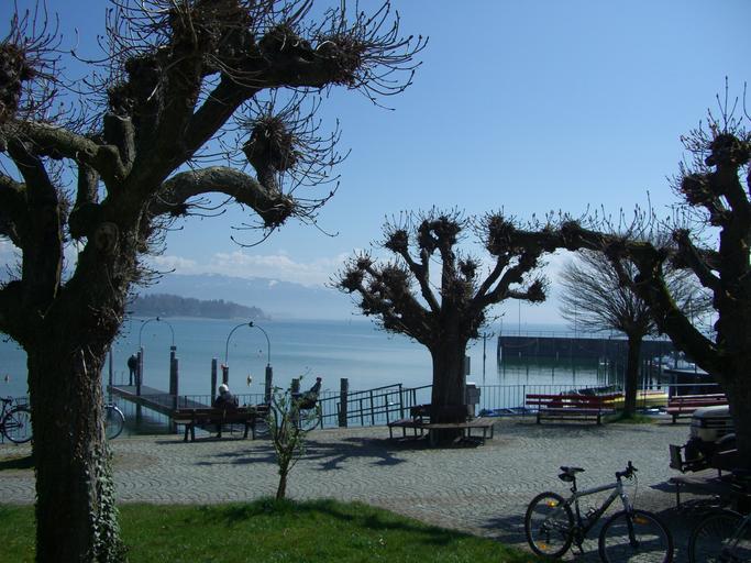 Keywords: promenade friedrichshafen lake constance plane trees tree plane kahl truncate beschnitten mountain panorama